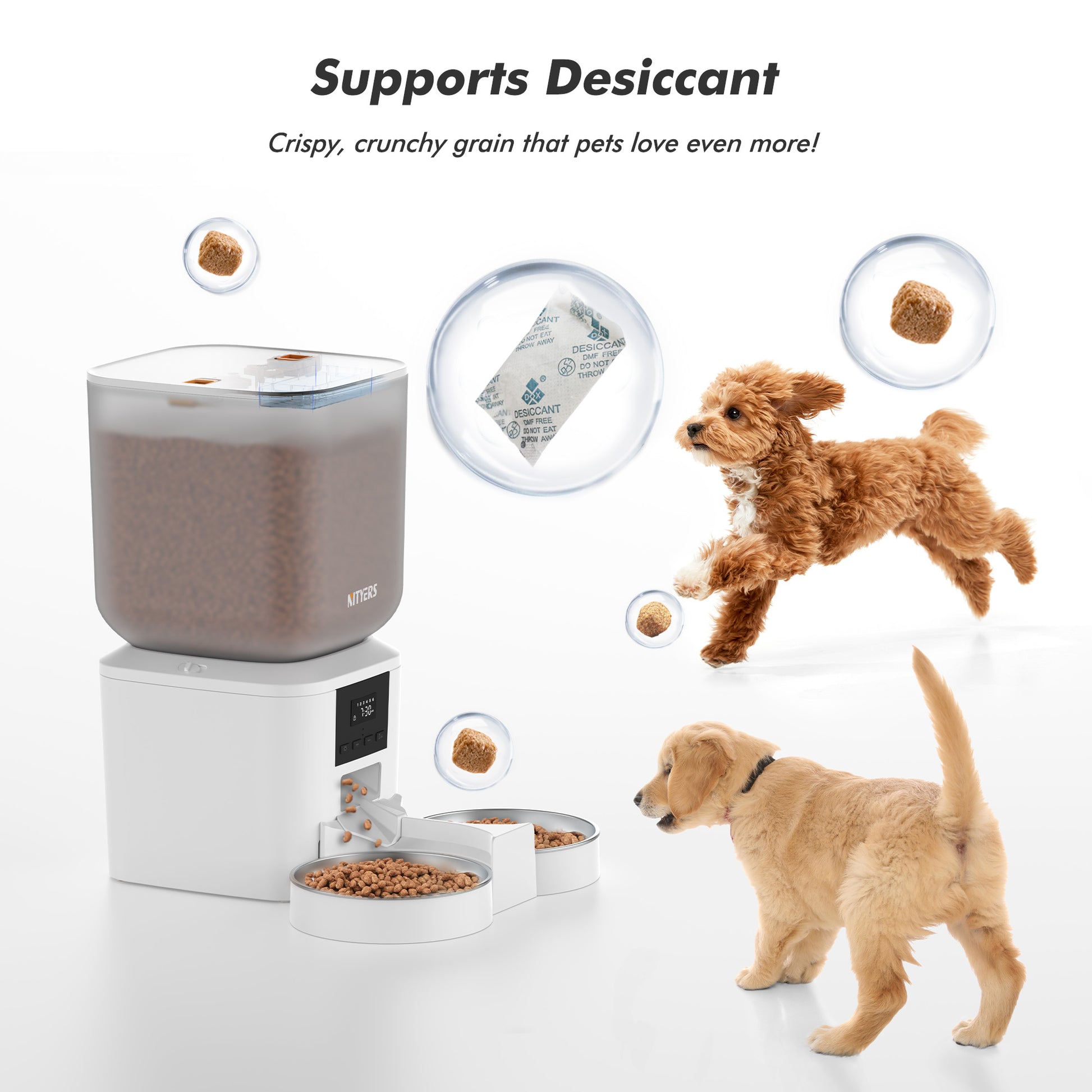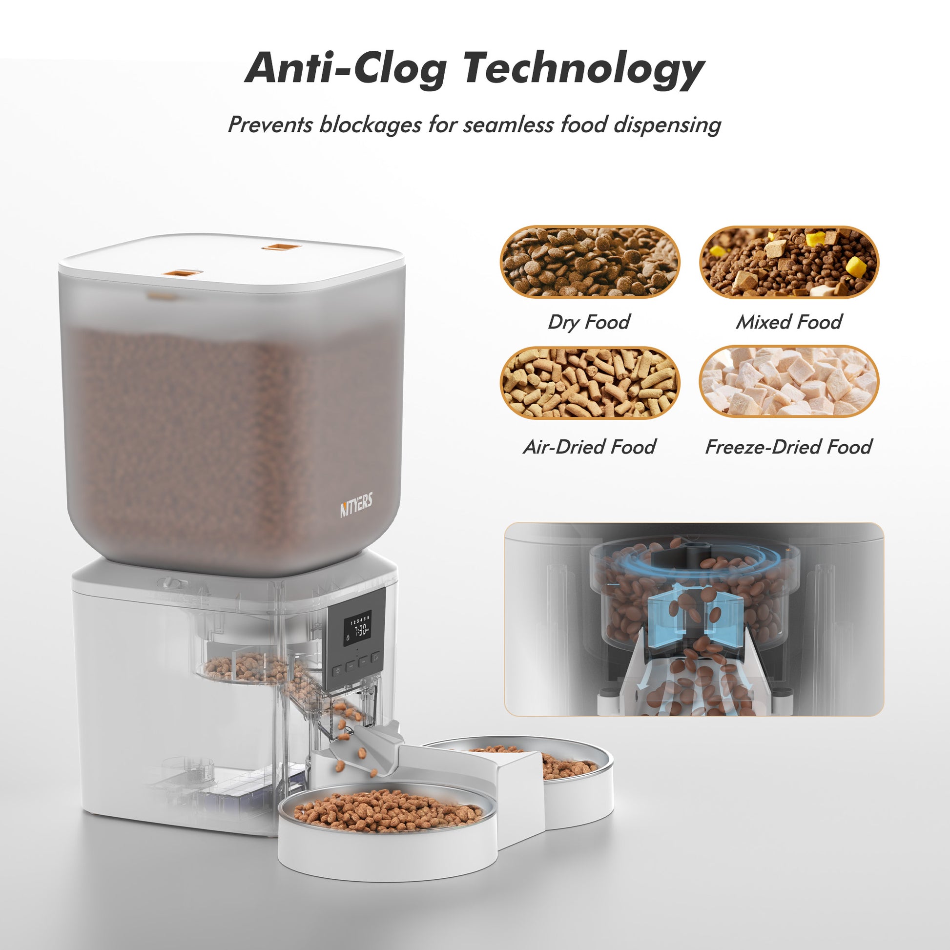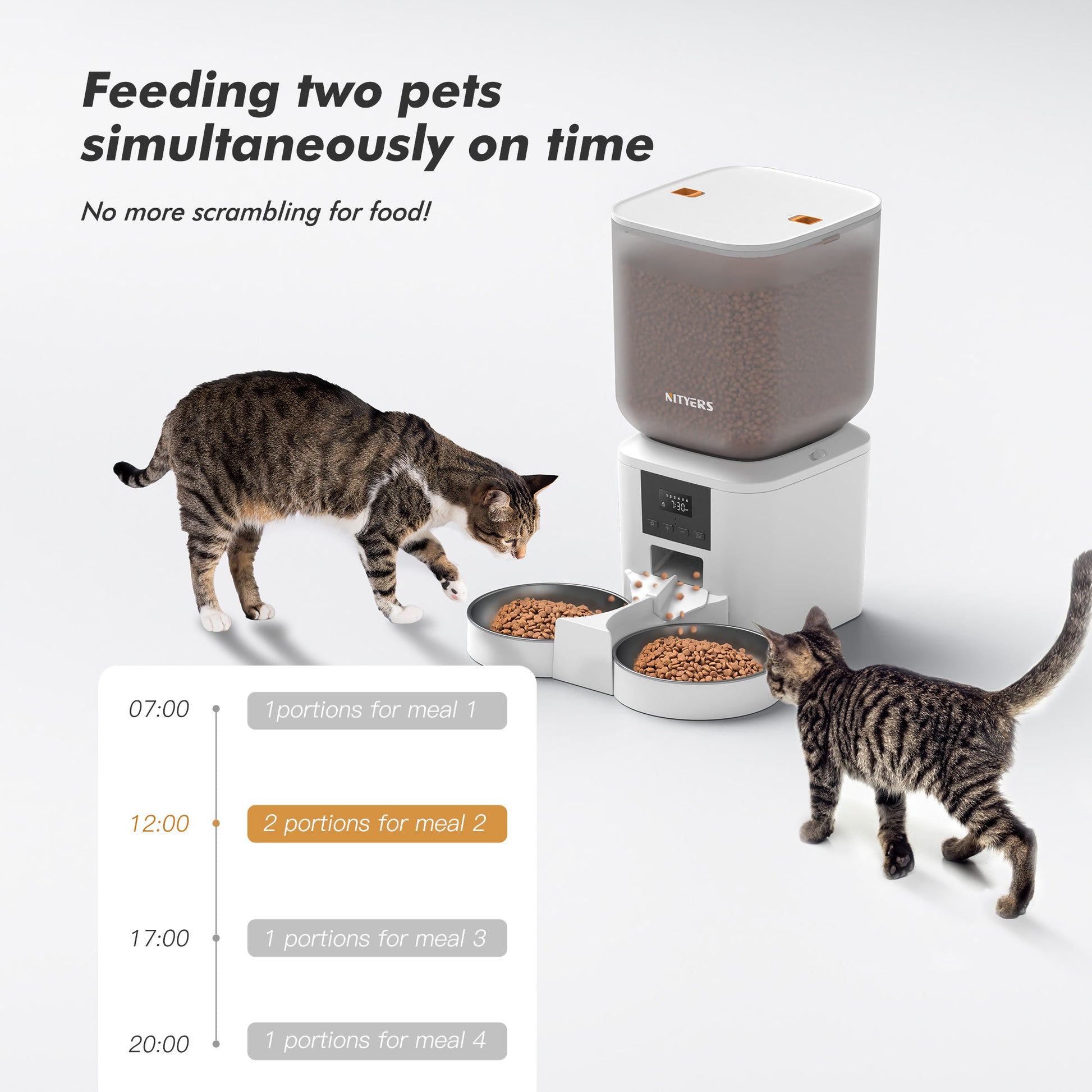 - Balanced Feeding for Two: The Nityers automactic pet feeder serves two cats or 2 dogs simultaneously, ensuring food is evenly distributed to both sides. This dual-feeding setup and central partition design promote harmony during mealtime, preventing competition and ensuring both pets get their fair share.
